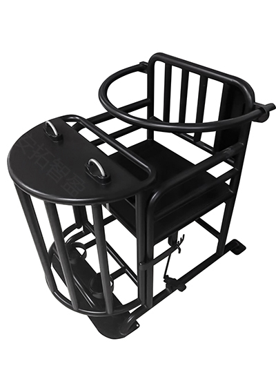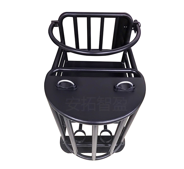 此椅子分为不锈钢和铁质两种,一侧有弹性开关,用脚一踩前方笼型门 便可打开,当笼型门关闭时脚部两环正好吻合,不易变形挣脱,前方固定有锁具,与其它椅相同;