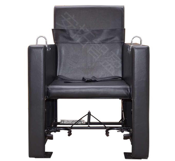 4、特性:审讯椅手部采用U型锁约束,U型锁下按至合适位置将嫌疑人手部锁住,扶手部位宽度便于签字书写;xiong部及腰部以约束带束缚;腿部以环形脚踏锁,jing员在椅后用脚踏可将锁打开,嫌疑人小腿置入,踩踏锁上,操作方便。