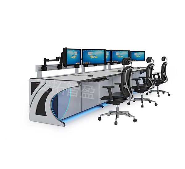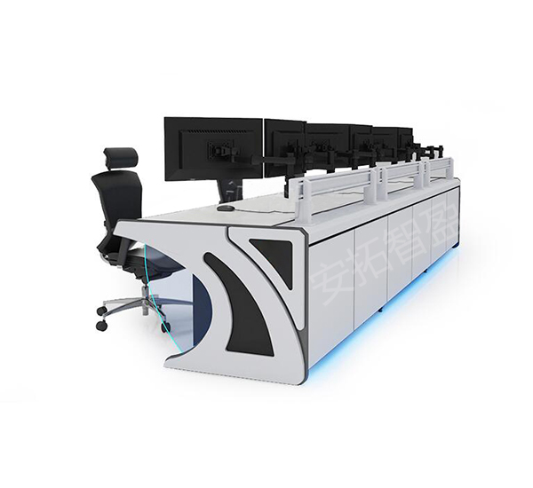 这是一张操作、指挥控制台,属于现代科技感的监控调*度设备。整体为长条形操作台,表面平整,边缘带有流线型装饰,兼具美观与功*能性。台面后方设有多个显示器支架,支持多屏联动,便于实时监控与数据处理。一边采用镂空或弧形支撑结构,增强空间感并方便布线。