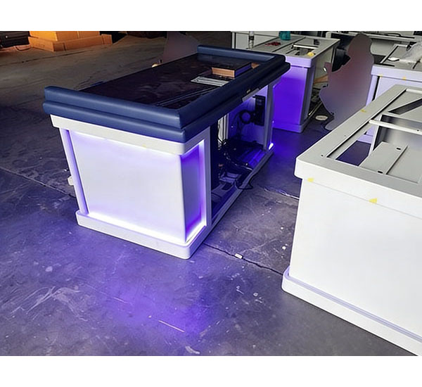 ②桌体正前方可加装7.5cm直径jing徽、摄像头、音响、录音等设备,也可加文字。 桌子两侧LED灯增强科技感;