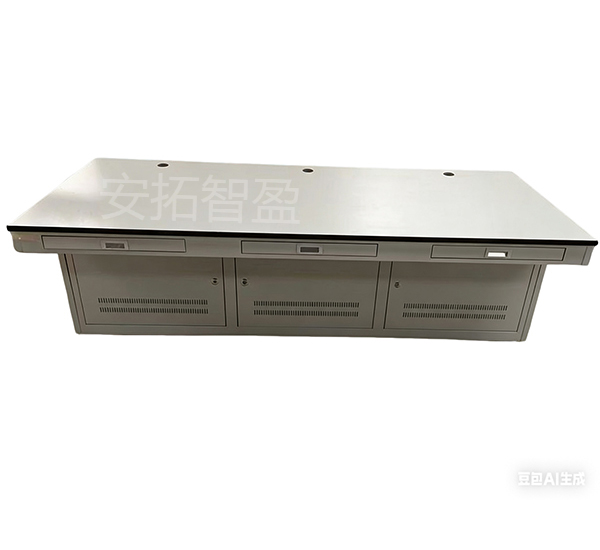 这是一张操作、指挥台一体化智能桌,设计简洁实用,属于现代科技感的监控调*度设备。表面平整,外观现代,线条硬朗,兼具美观与功*能性。支持多屏联动,便于实时监控与数据处理。