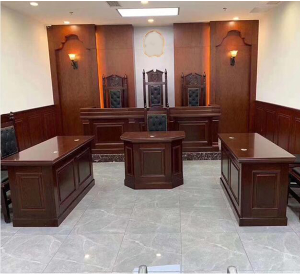 4、前挡装饰带设3个凹凸方块,中间方块镶嵌实木雕刻圆形法徽,搭配实木木线围边,主腿为凹凸方块造型,强化司法威仪与秩序感。选用优*质五金配件,部件拼接紧密牢固,间隙细小均匀,边缘打磨平整无毛刺,保障结构稳定与操作安*全。